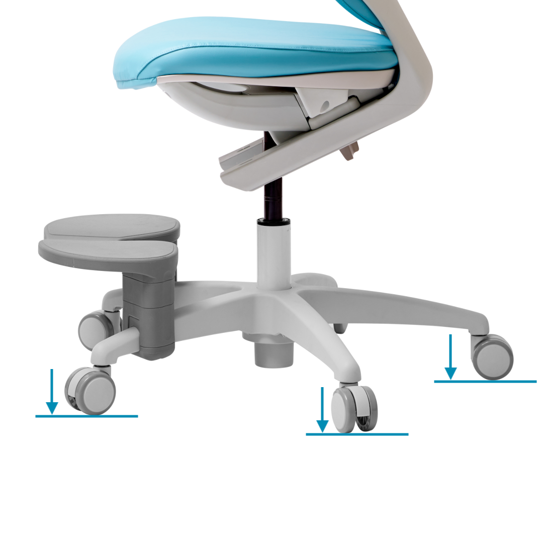 Bezpieczeństwo i koncentracja przede wszystkim. Krzesło wyposażono w system kółek, które automatycznie blokują się pod wpływem ciężaru użytkownika (powyżej 20 kg). Zapobiega to niekontrolowanemu odjeżdżaniu krzesła podczas nauki, co pomaga dziecku skupić się na zadaniach i utrzymać stabilną pozycję przy biurku.